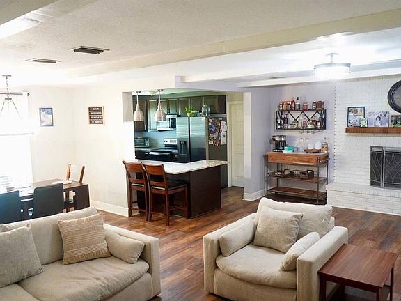 Nestled on over 2 acres in a tranquil country setting, this concrete block home offers serene privacy while still being just minutes from shopping, dining, and The Villages Charter Schools. Tucked back off the road behind a stately oak tree, the property presents classic rural charm. Step inside to discover a renovated interior with an open-concept layout, including a spacious great room anchored by a cozy fireplace, a dining area, and a light-filled kitchen. The kitchen features tile flooring, stainless steel appliances, granite countertops, beautiful cabinetry, a large sink beneath a picture window, and a breakfast bar with pendant lighting—perfect for casual meals and entertaining. Throughout the home, warm wood laminate flooring and dark cabinetry. This home comprises 4 generously sized bedrooms and 2.5 baths, including a master ensuite with a glass-and-tile walk-in shower and roomy vanity. The guest bath continues the granite theme with a square sink and tile-surround tub/shower combo. In addition, there’s a flexible bonus room ideal for use as an office, hobby space, or storage. Convenience meets smart upgrades with the indoor laundry room coupled with a half bath, offering easy access from the rear of the home. A tankless hot water heater accommodates the household’s needs efficiently. Outdoors, there’s a concrete patio and covered seating area perfect for relaxing or entertaining guests. A firepit for cooler evenings, plus a charming two-story playhouse tucked into the rear corner, add to the leisure appeal. A recently added 2-car garage, new propane tank, 4-board fencing, upgraded appliances, and a 2018 roof round out the structural and utility enhancements. Despite its peaceful, private ambiance, this home is well priced and ideally located—close to everything while maintaining a quiet, country lifestyle. Don’t miss your opportunity—schedule your private tour today!