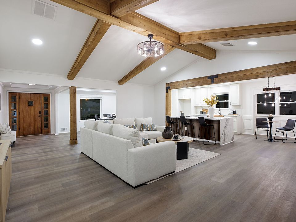 The heart of the home is the chef’s kitchen featuring quartz countertops, custom cabinetry, and stainless steel appliances. The spacious living area flows seamlessly to the backyard oasis complete with a sparkling pool, high wooden privacy fence, and plenty of space for outdoor dining or lounging.