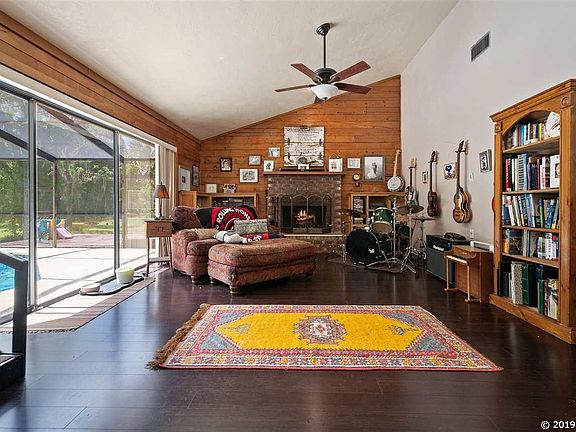 Beautiful log home with screen-enclosed pool and lovely landscaping set on almost 5 acres in Micanopy. Short commute to Gainesville or Ocala. Large open modern kitchen with stainless appliances and lots of storage. This open concept home has lovely wood walls throughout. Hardwood and tile floors. A great place to entertain. Enjoy the pool from your covered and screened patio, pool patio, and deck.