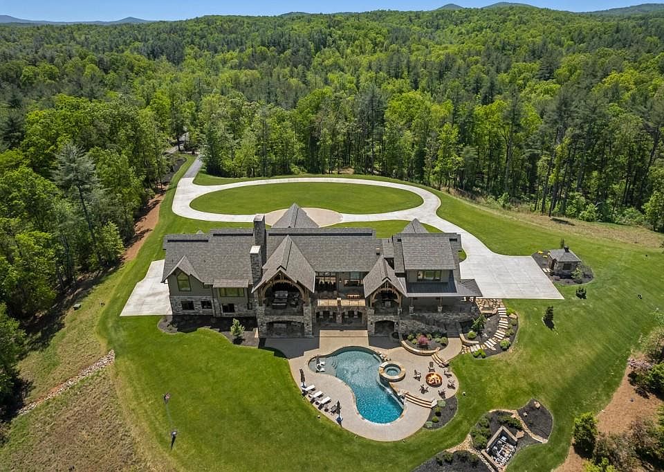 Introducing: Black Bear Lodge. Watch video tour here -> https://youtu.be/WTRtKHiKkJU This Mountain Estate sits on 14+ acres overlooking pristine lawns, rolling hills, sprawling trails, natural forest beauty, and 10 miles of mountain views. Designed by architect Steve Crane and constructed by R.E. Black Custom Homes, this 8,500 square foot lodge was completed in 2020 and took over four years to complete. Upon arrival, the multiple front porches featuring covered seating areas are perfect for outdoor living. The exterior of the home is finished with beautiful artisan hardiplank woodwork, stone, and cedar shake. Entering the grand foyer, 27-foot ceilings tower over the main living room, featuring a seven by five-foot Crab Orchard stone fireplace. This home boasts five masonry fireplaces designed by local stone artisans. The lodge features plaster walls throughout with red and white oak flooring in 6, 8, and 10-inch variations. The towering cathedral ceilings feature heavy mortise & tenon rough-sawn timber beams that extend into the kitchen. The Dining room and kitchen flow perfectly into the living room for effortless entertaining. Completed by Kingdom Woodworks and Francois & Co, the kitchen features; a 10 burner, 60 inch Blue Star range, Dueling 42-inch Wolf refrigerator and freezer, two Bosch dishwashers, a Wolf microwave, and a scullery featuring a 42-inch Miele refrigerator and freezer with wet bar and ice maker. Off the kitchen and living room, sliding glass doors will welcome you to a two-story stone balcony. Complete with outdoor living featuring a fireplace, ample room for dining, and a covered kitchen featuring; a 6-burner Wolf stove top, Kitchen Aide warming and cooling drawers, Sharp microwave, beverage cooler, sink, ice maker, leathered Black Pearl countertops, a 60-inch Santa Maria grill and Bromic heating systems; this terrace has it all. As you head down the Texas Flagstone stairs, you are greeted by the seven-foot fire pit, hot tub, and heated pebble tech saltwater pool, and views of the lawns and mountains. Off the kitchen there is a half bath, laundry room and three-car garage with epoxy flooring. The upstairs features a bedroom with a study and multi-use bunk and playroom. The primary bedroom features a fireplace, vaulted ceilings, and views of the pool and mountains. The spa inspired bathroom is designed with an oversized Karya Royal marble shower, floating bathtub, duel vanities, Kholer toilets and a Biobidet. Off the bathroom are substantial his and her closets and an elevator to the terrace level. The grand timber frame staircase to the terrace level will greet you with reclaimed Terracotta Parefeuille flooring imported from France. With rough-sawn distressed beams, the terrace level features a full bar with a built-in TV, Bosch dishwasher, Subzero icemaker, two wine coolers, multiple beverage drawers, and a microwave. There are two separate living areas with another masonry fireplace, pool table, three full guest suites, full bathroom for pool guest, and an office. This estate also features a full-home generator, Hellenbrand water filtration system, moonlighting and canopy landscape lighting across the grounds, foam insulation throughout, smart home Lutron lighting systems, two tank less water heaters, Kolbe casement windows throughout, drapery remote control, state of the art security with hard wired cameras, and more.