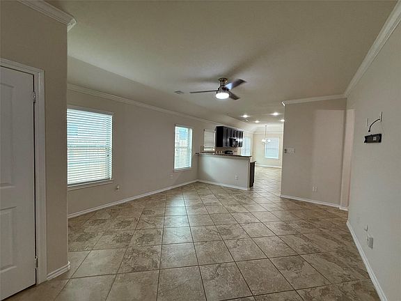 Granite in master bathGranite countertops in kitchenTumbled stone backsplashBreakfast bar in kitchenCrown moldingTile in family room