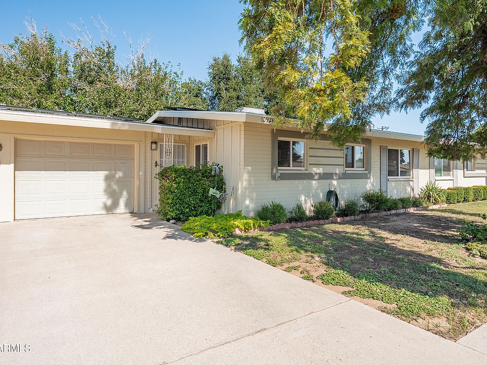 Welcome to this charming and updated 2-bedroom, 2-bathroom home in the heart of Sun City's 55+ community. This well-maintained home sits in a quiet, friendly neighborhood and offers comfort, style, and energy efficiency with its owned solar system. Inside, enjoy vinyl and tile flooring throughout and a modern kitchen featuring gray cabinetry, white countertops, backsplash, and matching white appliances. A serving bar overlooks the living room, perfect for entertaining. The spacious primary bedroom includes an adjoining bath with a walk-in shower, while the second bedroom has its own private bath. Relax year-round in the enclosed Arizona room, overlooking a peaceful backyard with private patio, pergola, and mature citrus trees. A single-car garage completes this delightful, move-in-ready