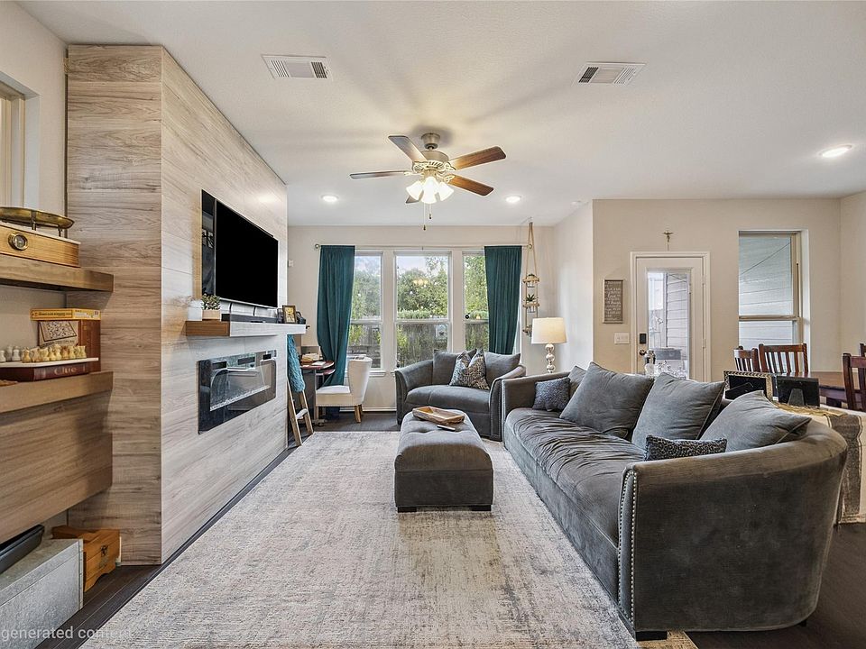 Southern-facing balconyTesla ev chargerWood floorsNew flooringOutdoor fanQuartz countertopsModern kitchen