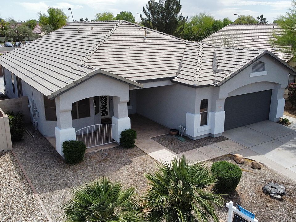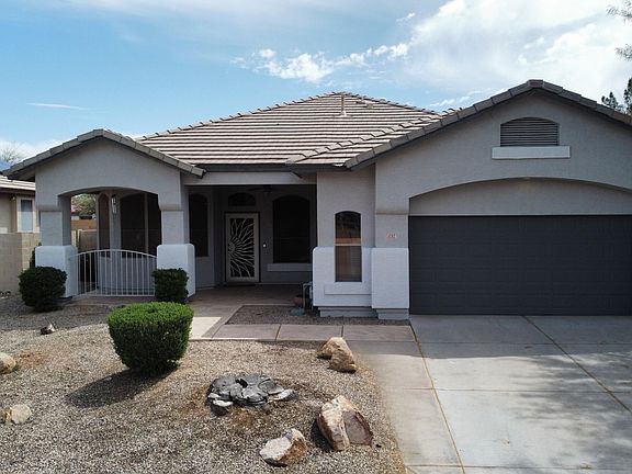 Seller offering concession for new flooring!! Located in the beautiful Carol Rae Ranch Community on a large private lot with no neighbors to the east this home has something for everyone. The front features a wonderfully large covered porch, low maintenance desert landscape, two car garage, solar shades for energy efficiency, and privacy. Fresh Exterior paint. Through the security door is a grand front room complete with bay window, lots of natural light, 9' ceilings, diagonal laid tile floors, and tasteful modern paint tones. The spacious and open layout, living room design, large windows, and the huge amount of storage in the kitchen all make this home special. The primary bedroom features a large walk-in closet, dual vanity, glass shower, separate tub and a private entrance from the back yard oasis. . In the back you will find a fenced in sparkling pebble tech play pool, low maintenance and luscious landscape, covered patio, and modern pavers. The perfect space for relaxing, entertaining, and enjoying your new home. Located a few minutes from Banner Gateway, the brand new Fry's Marketplace, great dining, entertaining, and near multiple malls for shopping, plus freeway access for quick commuting. Many more features along with new carpet in the bedrooms just installed. This is a must see home!