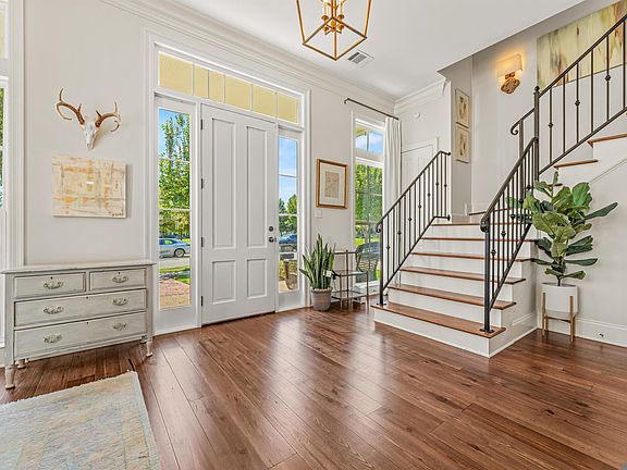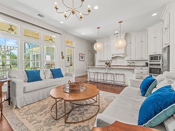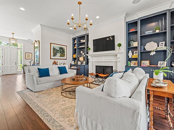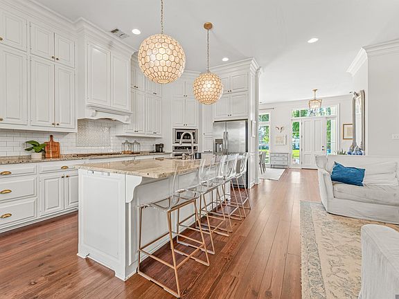 Exquisite two-story home in The Preserve at Harveston, where classic Southern architecture meets modern luxury. With its inviting curb appeal, covered porch, and stately columns, this home leads directly into an open floor plan featuring rich, dark hardwood floors and soaring ceilings. Sizeable windows throughout all the living areas flood the space with natural light, creating a bright and airy feel. The heart of the home is the pristine white gourmet kitchen with granite countertops, a subway tile backsplash, gas cooktop, wine cooler and high-end stainless steel appliances, all anchored by a large island with unique globe pendant lights. The kitchen flows seamlessly into the living room, highlighted by a fireplace and stunning navy-blue built-in bookcases. The expansive foyer opens to a formal dining space. The elegance continues outdoors with a covered patio, a pergola, and a stylish outdoor kitchen featuring a blue and white patterned tile backsplash, a built-in grill, and the spacious backyard backs up directly to the community walking path. As a resident, you will also be within walking distance of exceptional community amenities, including a resort-style clubhouse, pool, hot tub, scenic walking trails, lakes, and year-round neighborhood events, offering a truly exceptional lifestyle in one of Baton Rouge's premier neighborhoods.