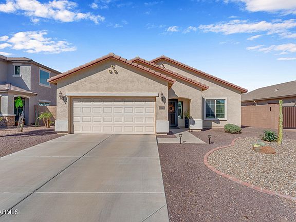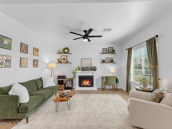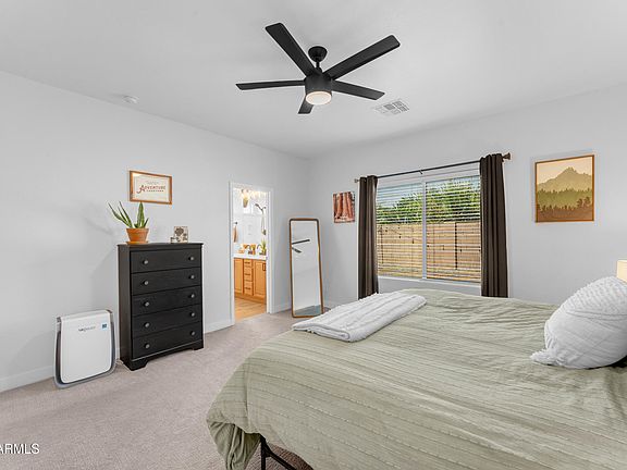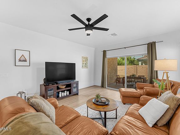 The spacious primary suite features dual vanities, a walk-in shower, and a large walk-in closet, while the secondary bath includes a shower/tub combo. Additional highlights include ceiling fans throughout, a tankless water heater, and an iron security gate at the front entrance for added peace of mind. Outside, enjoy a backyard designed for relaxation with real grass, a covered patio, and space to unwind while watching beautiful Arizona sunsets. The property also offers low-maintenance desert landscaping in front, complete with a lemon tree, and a 2.5-car tandem garage providing ample storage. Ideally situated on a North / South facing lot, with easy access to the Loop 202, US 60, and State Route 24, this desirable East Mesa location is surrounded by popular restaurants, shopping centers, and multiple grocery options. Exciting new dining and retail developments surround this location and add even more convenience as the area continues to grow. This home delivers comfort, functionality, and the best of Arizona living!
