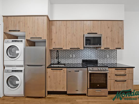 The spacious layout features a modern design with high-end finishes throughout. The open kitchen is equipped with stainless steel appliances, stone countertops, and custom cabinetry. A full-size in-unit washer and dryer brings added convenience, while the enormous walk-in closet provides incredible storage rarely found in studio living. Residents also have access to a beautiful common-area roof deck.