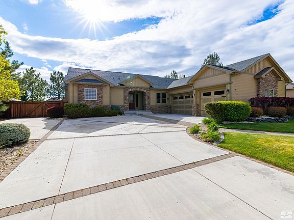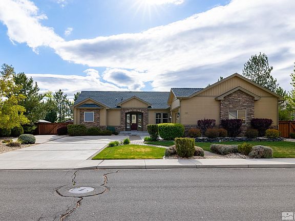 Meticulously maintained and beautifully crafted, this exceptional home in the sought-after Rocky Terrace subdivision offers a perfect blend of elegance and modern upgrades. A grand formal entry welcomes you into the spacious great room, where soaring vaulted ceilings and cathedral windows frame peekaboo mountain views. The striking ledgestone rock hearth fireplace adds a touch of warmth and character to the open, airy space., The expansive kitchen is a chef's dream, featuring abundant cabinetry, gleaming granite countertops, and premium stainless steel appliances, including a 5-burner GE Profile gas range, and a brand new microwave. Two breakfast bars offer ample seating for casual dining and are perfect for hosting friends and family. The well-thought-out split floorplan provides privacy for the master suite, which boasts an elegant travertine-appointed bathroom. Both the master and guest bathrooms have been upgraded with newly installed bidets, adding a level of luxury and comfort. Two guest bedrooms are conveniently connected by a Jack and Jill bathroom, offering private access for each room and featuring dual sinks, ample storage, and a shared shower/tub combination—a practical and comfortable arrangement for family or guests. A cozy office nook in the hallway features a built-in desk, overhead cabinets, and shelving, creating a functional workspace with plenty of storage. This home also offers a garden bed in the backyard, perfect for a vegetable garden, allowing you to enjoy homegrown produce. This home is equipped with modern conveniences, including a Generac backup generator that automatically activates during power outages, new carpet (2018), a central vacuum cleaner, a solar tube in the laundry room (2022) that brings in extra natural light. The exterior was freshly painted (2022), leaf filters were added to the gutters (2023), and the entire HVAC system was professionally cleaned in 2024 for optimal performance. Also, the home is listed as having a 3 car garage, but the single car bay is oversized so it's more like a 3 and a half car garage! Extra room for your toys and tools! Located just minutes from town, this meticulously maintained home offers privacy, peekaboo mountain views, and easy access to all the amenities Gardnerville has to offer. Don’t miss the opportunity to make 1094 Rocky Terrace your forever home! Home and carpets were just professionally cleaned.