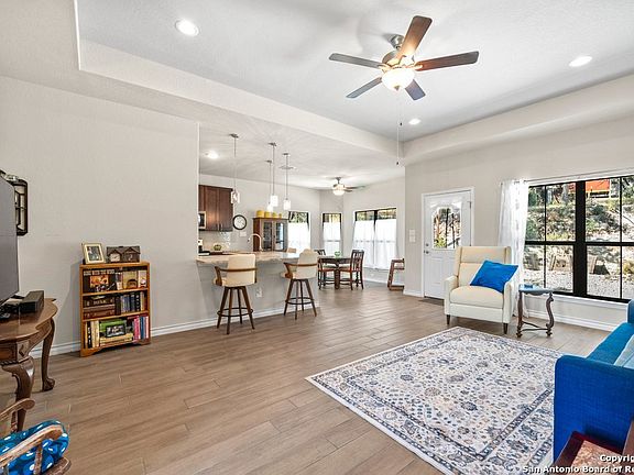 Like-New Move-In Ready Home with Hill Country Views - Attractively priced for immediate interest! Lightly lived in and used only for weekend getaways, this home feels practically brand new and is ready for immediate move-in. Enjoy breathtaking Hill Country views from an open, naturally lit floor plan featuring no carpet throughout and a charming bay window in the dining area. The kitchen is a true centerpiece, boasting custom cabinetry, a spacious island, and deep storage drawers designed for convenience and style. Refrigerator, Washer, and Dryer will convey with sale! Each bedroom includes its own walk-in closet, providing generous storage and comfort for every member of the household. The primary suite showcases elegant tray ceilings, while the secondary bedroom feature beautiful vaulted ceiling that enhance the home's airy, welcoming feel. Thoughtful details such as recessed lighting, ceiling fans, and extra-wide doors ensure both comfort and accessibility throughout. Step outside to a low-maintenance fenced backyard ideal for relaxing or entertaining, with an untouched second portion of the lot offering endless possibilities for natural vision or future usage. Meticulously maintained, move-in ready, and strategically priced to sale - this is the Hill Country home you've been waiting for!