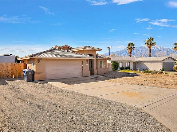 Welcome to this charming 2004-built home located in beautiful Desert Hot Springs, offering picturesque views of the San Jacinto and Santa Rosa Mountains. This inviting residence boasts 3 bedrooms, 2 bathrooms, and over 1600 square feet of interior space, all situated on a spacious lot spanning 9147 square feet, complete with an RV pull-through feature. Step inside to discover a remodeled kitchen, the heart of the home, featuring elegant quartz countertops, modern gray cabinets, recessed lighting, ample counter space, stainless steel appliances, and a decorative backsplash. The kitchen also offers a separate dining area and additional seating at the breakfast bar, perfect for casual dining or entertaining. Adjacent to the kitchen is the cozy living room, creating a semi-open feel with ceilings soaring above 9 feet. On chilly evenings, you can gather around the fireplace and enjoy its warmth and ambiance. The generously sized bedrooms provide ample space for unique furniture arrangements, ensuring comfort and versatility. Outside, the large backyard beckons you to relax under the lattice patio cover while taking in the breathtaking mountain views and stargazing in the evenings. With plenty of room for a custom pool and spa, this outdoor space is ideal for outdoor entertaining and leisure activities. This home is perfect for first-time homebuyers, second-home seekers, and investors alike. Don't miss out on the opportunity to make this your dream home. Welcome home!