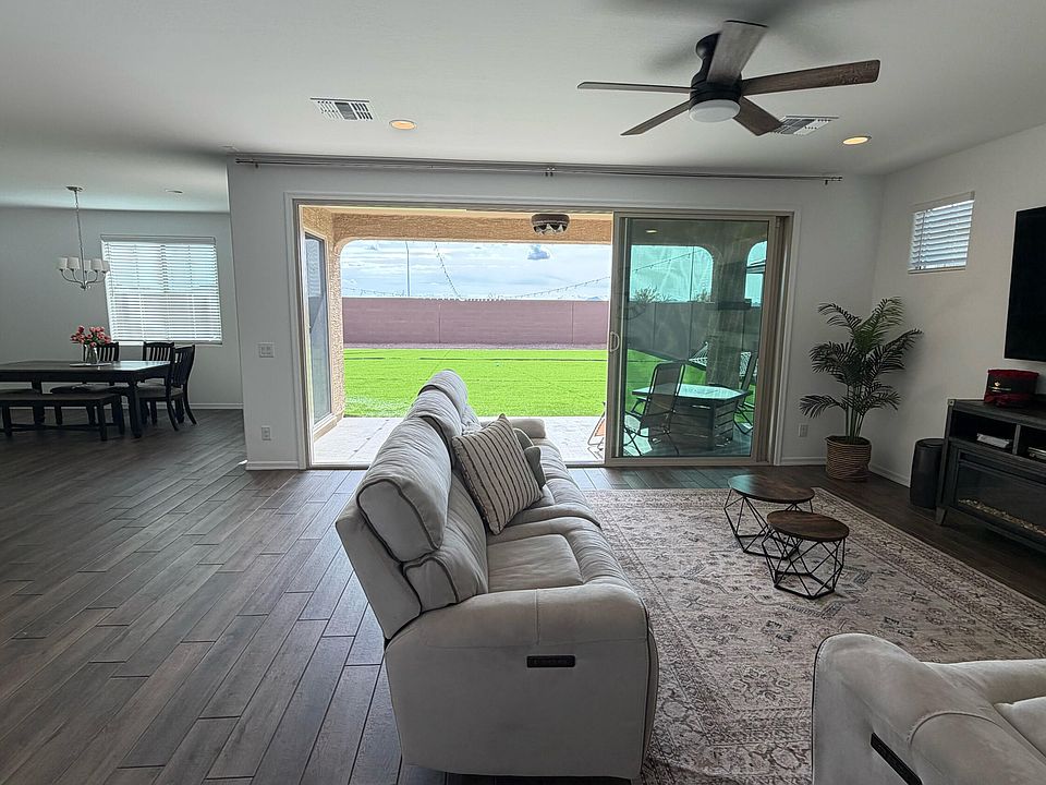 A 15-foot sliding glass door opens to the extended covered patio, ideal for indoor-outdoor living. The 50×50 backyard is ready for your personal touch, with turf prepped for installation and a built-in misting system for hot summer days.