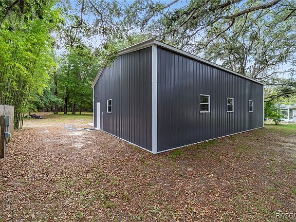 Situated on a double lot adjacent to the Florida Greenway acres of natural preserve, this property offers privacy, natural surroundings and versatile living. The residence includes a 12-by-32-foot covered rear deck, great for outdoor relaxation with views of the fire pit and wooded landscape. An insulated aluminum roof, installed in 2024, provides shade and year-round comfort. A newly constructed 30-by-40-foot insulated metal building features three 8-foot bay doors, providing ample storage and workspace. Adjacent to the structure is designated RV parking with a 50-amp power connection. The three-bedroom, two-bath manufactured home features a dedicated laundry room, a primary bath with generous dimensions and a wood-burning fireplace. A heavy-duty metal roof, installed in 2005, carries a life expectancy of more than 50 years. Located in the Rio Vista community, residents enjoy park access with direct entry to the Rainbow River. Outdoor pursuits such as kayaking, boating and fishing are easily accessible in this tranquil and scenic setting. Nestled within the Rio Vista community, this property benefits from a neighborhood known for its serene ambiance and strong sense of community. Residents enjoy access to a park with direct entry to the crystal-clear Rainbow River—great for kayaking, tubing, or simply soaking in the natural beauty. The area is celebrated for its lush landscapes, abundant wildlife, and peaceful atmosphere, making it a haven for outdoor enthusiasts and nature lovers alike. With a welcoming environment and a reputation for quiet, riverside living, Rio Vista offers a lifestyle that blends recreation, relaxation, and community charm.