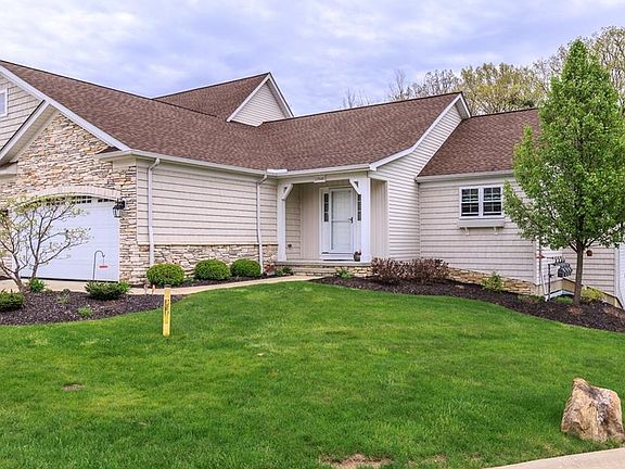 Enjoy this rare find!!! A very lovely ranch condo with walkout basement. Very well taken care of and tastefully decorated. Nice size foyer and spacious dining area. Large kitchen with lots of cherry cabinets and newer appliances will stay. The great room has a beautiful fireplace with tasteful mantel and insert. the decorating is of neutral décor and the plush carpet is a delight. Two spacious bedrooms with large closets and their own bath is a certain plus. Off the great room is a two tier deck that has been refinished in the past year. The yard is private and wooded. The home has all new windows with a warranty on the first floor. The light fixtures have all been replaced, also. The home has a sprinkler system in the front of the property.The lower level is unfinished and a large space to design as you choose. This is truly a special home with pride of ownership.!! One year home warranty included..