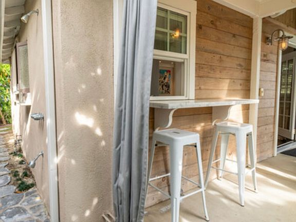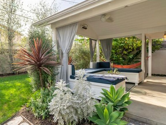 Enjoy the lovely LA weather from your own beautifully landscaped backyard. French doors open from this charming ADU cottage to a spacious, covered patio and a large, private garden. A true place to relax, with a built-in Smart TV, an electric heater, fan, custom built sectional, counter with bar stools and a pass -through window for easy access to the cottage kitchen. Inside, the cottage is furnished with a comfortable, queen-sized Murphy bed, which easily converts to create an equally comfortable sofa. The kitchen includes refrigerator, microwave, toaster-oven, induction cook top, dishes, glassware, cutlery, pots and pans. Window air conditioner and free standing electric heater are included. There is a storage cabinet behind the sofa and ample storage built into the outdoor sectionals. In addition, a free-standing storage shed is tucked into a corner of the backyard. There is a washer/dryer combination for your exclusive use. Street parking only. There is an additional $150 monthly utility charge which covers landscaping, garden maintenance, electricity, water, sewer, and trash. Minimum six month lease. Longer lease is negotiable
