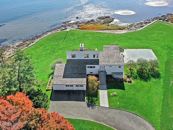 SOUTHPORT WATERFRONT - SPECTACULAR ROCK POINT ON LI SOUND - With a sensational Long Island Sound location, at the mouth of idyllic Southport Harbor, this spectacular 1.8 acre property features 430 feet of water frontage with a Beach and panoramic, sweeping views of the Southport, Fairfield and Westport coastlines and Long Island Sound.  A thorough renovation by renowned architect and New York Modernist, Charles Gwathmey, beautifully enhanced over 4000 square feet of living space, creating stunning interiors and expansive decking. Superb architectural detailing and elements are evidenced throughout. The main level offers Living Room, Dining Room, and the luxurious Primary Suite all opening onto the expansive Deck, a very well-appointed Kitchen, Powder Room and Butler's Pantry/Laundry room. The Terrace Level with Family Room and three well-proportioned Bedrooms, enjoys access to a covered Terrace, the inviting Pool, Beach, and Long Island Sound beyond.  Within close distance of Southport Village and Metro North Train Service to New York City, this is truly an extraordinary residence with an exceptional property and splendid waterfront location. Gated entries at street and property.  Main Level:  Entrance Hall with hardwood flooring and Guest Closet.  Living Room with hardwood flooring, architectural cabinetry, open wood-burning Fireplace with slate surround, vaulted ceiling with Fan, and sliding doors to Deck.