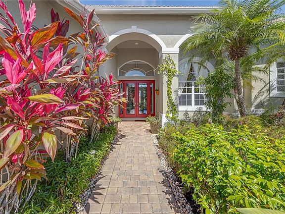 Welcome to your Oasis in Paradise! If you are looking for a Large 3000 Sq Ft. Under Air 4 Bedroom Plus Den 3 Full Bath Spacious Pool home in a private setting at a Great Price AND NOT IN A FLOOD ZONE, this is it! Situated on a Quiet and Amazing Unique Cul De Sac Lot (large pie shape in the back with a wide front) overlooking Expansive Water Views with NO homes on the other side of lake, this impeccably maintained Grand Floridian model sits on almost one-half acre in the Beautiful, Gated Community of Waterways of Naples. Mature Tropical Landscaping surrounds the home. You will enjoy Spectacular Waterfront Sunrises and Sunsets from your back yard. Enjoy a cup of coffee in the morning or dinner poolside while watching the Wildlife on the Lake. Outdoor enthusiasts will enjoy Boating (electric motor), Kayaking and Fishing in Waterways’ private 150-Acre Lake or the amenities at the community clubhouse. Storage lot available for RVs and Boats. There is a private back entry walkway into Corkscrew Elementary and Corkscrew Middle Schools; Palmetto Ridge High School is just a short distance away. Low HOA fees. Many features/upgrades include but are not limited to: a dual HVAC system; Three-Car Garage; Arched Façade on garage front; Huge Brick Paver Driveway and Custom Walkway with Fountain; High Ceilings; Solid Hardwood floors (Asian Rosewood) in den/office and primary bedroom; Tile Floors throughout main area, and other bedrooms have high-end laminate flooring; Glass French doors on Front Entry and Interior Office/den and Living Room Doors leading to the back to lanai; Extended Lanai; Updated Kitchen, Bathrooms and Laundry room, 5-1/4” baseboards throughout home; Crown Molding in primary bedroom, office/den, dining room and pool bath; and Custom Shades and Blinds. New Roof and A/C units in 2018, New Water Heater 2023, New Stainless Range (less than 6 months), newer Stainless Refrigerator and Dishwasher. This is the Largest Home, on the Best Lot currently available in Waterways. SEE SUPPLEMENT PAGE FOR FLOOR PLAN!