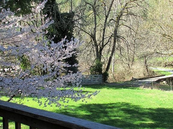 A little piece of tranquil paradise ... those are the first thoughts that come to mind upon arriving at this wonderful Applegate property. Irrigated green pastures and the sounds of bubbling, crystal clear Thompson Creek are the first to greet you on this 5.22 acre parcel. Closely followed by a quaint country lane to the 1,841 sq. ft. house ~ featuring a spacious great room, vaulted ceiling, rock fireplace, plenty of windows and a wonderful wrap around deck to take in the fabulous views. With a convenient 2 + car detached garage/shop and cute seasonal creek fed pond ....the setting is complete. Now add a majestic backdrop of pines ~ and the property is perfect! Blending privacy and function ~ you'll also enjoy lush garden areas, fruit trees, walking paths and a 2 stall animal mini-barn w/ feed room (perfect for 4H or FFA projects) yes, this property has it all. Take a tour today and see for yourself why it won't last long!