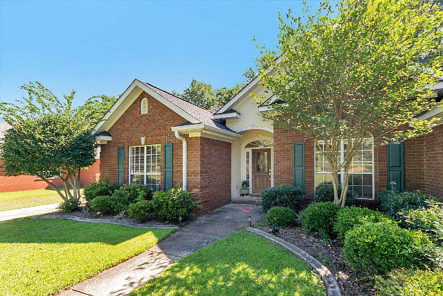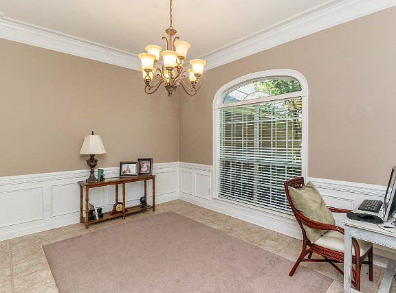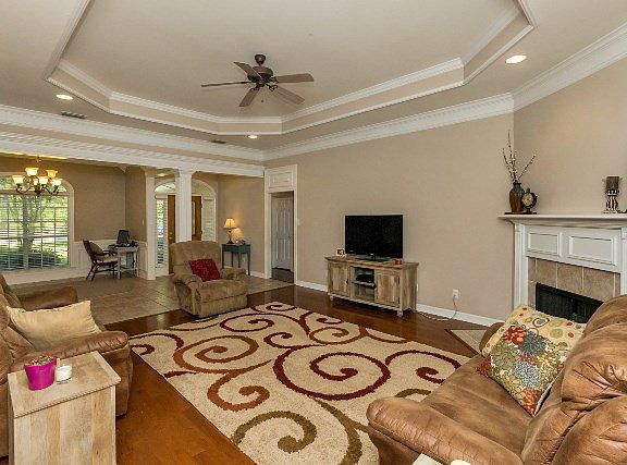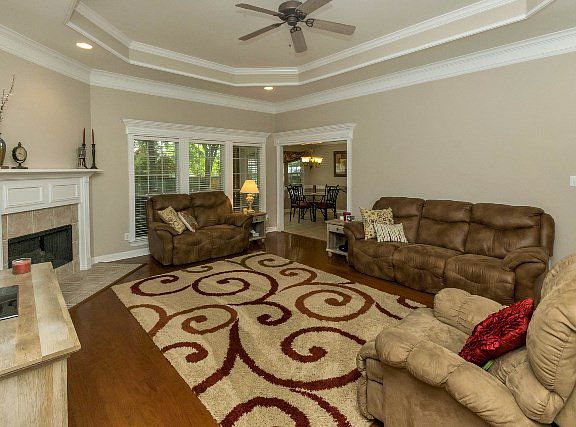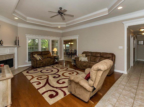 This luxurious 4 bedroom home welcomes you from the minute you walk into the foyer through the beautiful leaded glass front door. Decorative cream tile flows throughout the foyer, dining room, hall, kitchen and laundry room. Architectural touches such as high ceilings and crown molding are everywhere. The dining room boasts wainscoting. The open floor plan draws you into the large family room with its gas fireplace and mantel. The kitchen has beautiful solid wood cabinetry, granite countertops, a breakfast bar, and a sunny window overlooking the back yard where you can casually dine. The master bedroom is on the right side of the house; the other 3 bedrooms are on the left, making for privacy and an oasis retreat with a large separate tub & shower and 2 sinks in the master bath. The master bedroom also has a large walk in closet! The amply sized laundry room is next to the garage and centrally located off the kitchen. Hardwood flooring is in the family room; the bedrooms are carpeted.