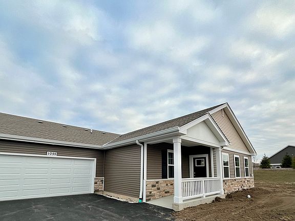 Envision yourself at 1095 Williamsburg Street in Pingree Grove, Illinois, a beautiful new home in Cambridge Lakes North. This ranch townhome is move-in ready. Homesite is low maintenance and includes a fully sodded yard. This Callihan plan offers 1,360 square feet of living space, 2 bedrooms, 2 bathrooms, 9-foot ceilings and a 2-car garage. When you first enter the home, there is a secondary bedroom and full bath with closet space. Down the hall, you will enter the open concept great room and kitchen. The kitchen layout includes a large island with an overhang for stools, quartz counter tops with a stainless steel overmount sink, and white cabinetry. Additionally, the main floor includes easy-to-maintain luxury vinyl plank flooring and walk-in laundry room. Enjoy your private get away with your spacious primary bedroom and en suite bathroom with a raised height dual sink, quartz top vanity and walk-in seated shower. Cambridge Lakes North is picturesque community, with its scenic charm centered around a vibrant outdoor pool and pavilion, BBQ and firepit, playgrounds connected with miles walking paths. Enjoy being minutes from easy access to Route 47, Route 20 and Route 72 or commute to Chicago in under an hour via I-90 or the nearby Metra Train. Plus, close to Randall Road shopping corridor with lots of restaurants! All Chicago homes include our America's Smart Home Technology, featuring a smart video doorbell, smart Honeywell thermostat, Amazon Echo pop, smart door lock, Deako smart light switches and more. Exterior photos of actual home. Interior photos are of similar home and model home. Actual home build may vary.