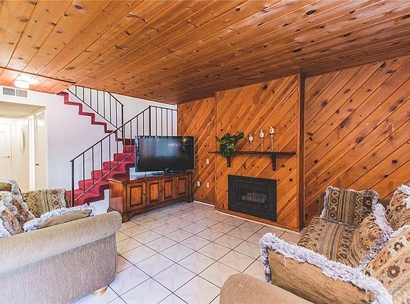 Vinewood Village Townhomes offers this 3 bedroom, 1.5 bath 2 story home with 1,207 square feet of living. Large living room highlighted by knotty pine paneling, cozy fireplace, beautiful tile flooring. Kitchen's ample cabinets and pantry room with easy care flooring, plus an adjoining dining area with large breakfast bar and direct patio access. All 3 bedrooms are upstairs with carpeting, each individual with wall air conditioning and high wood beam ceilings. 1/2 bath downstairs for your guest. Home offers Central heat and air for year round comfort, 2 car attached garage with laundry hook-ups and lots of storage room. Community offers swimming pool, recreational room, and lots of guest parking. Low HOA covers water, trash and outside maintenance.