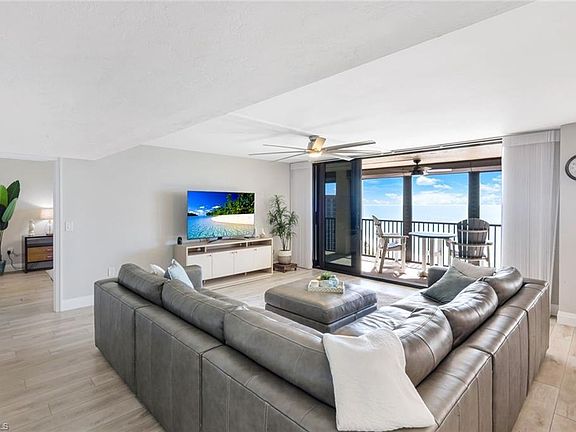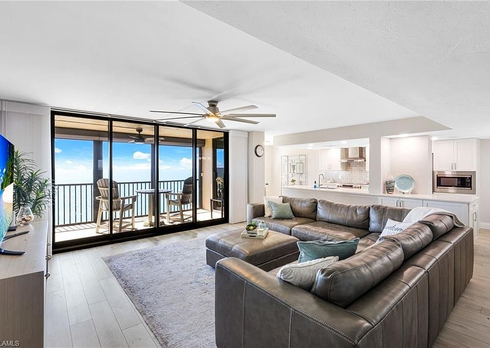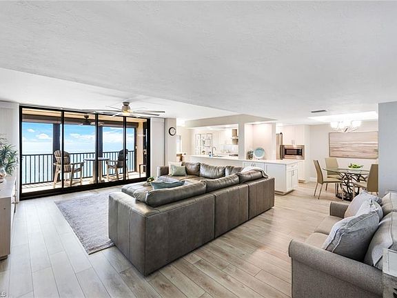 Freshly reimagined with a refined coastal aesthetic, this fully turnkey residence captures breathtaking, unobstructed views of Vanderbilt Beach and the Gulf. Every detail has been thoughtfully curated—from the designer Baer’s/Bernhardt furniture and art collection to the Hunter Douglas motorized shades, contemporary lighting, and wide-plank luxury flooring throughout. The bright, open kitchen showcases white shaker cabinetry, quartz countertops, and a spacious island with integrated dining and workspace, perfect for effortless entertaining and everyday living. The lanai is enhanced with brand-new hurricane-impact sliders and electric storm shutters, creating a seamless indoor-outdoor retreat overlooking the Gulf. The primary suite opens directly to the lanai and features a spa-inspired bathroom and generous walk-in closet, while the guest suite offers privacy, ample storage, and a welcoming coastal charm. Residents of Vanderbilt Gulfside enjoy an amenity-rich lifestyle across more than 8 acres of manicured beachfront grounds—boasting 750 feet of pristine shoreline, a heated saltwater pool (the largest on Vanderbilt Beach), two guest suites, two tennis courts, Tesla charging stations, grilling areas, a fitness center, and secure gated entry with covered deeded parking and private storage. With strong reserves, comprehensive insurance, and an unmatched beachfront setting, this property combines timeless coastal elegance with peace of mind and exceptional value.