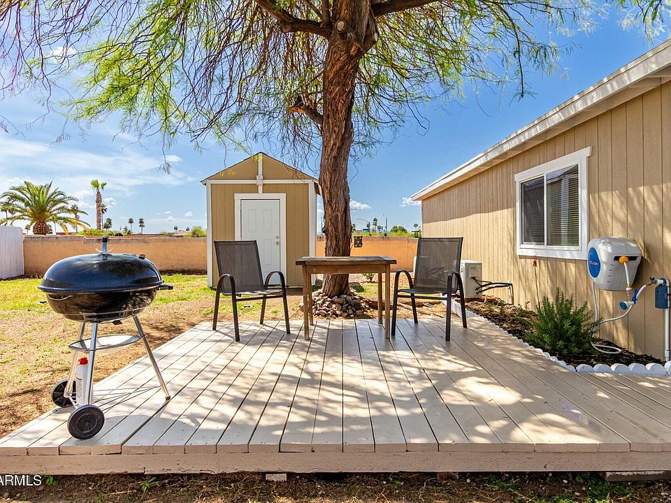 This charming 4-bed, 2-bath manufactured home offers comfort and style. Inside, you'll find laminate wood flooring in the main living areas and an open kitchen with white cabinets and a breakfast peninsula. Roof has been sealed with UV-resistant silicone for added durability and weather protection. The bedrooms feature neutral carpet and ceiling fans for added comfort. The Primary bedroom showcases a garden tub. This home also includes all appliances—refrigerator, washer, and dryer—along with a water softener system for added convenience. Outside, enjoy a private, fully fenced backyard with a covered back patio and wood deck, perfect for relaxing or entertaining. A storage shed provides extra space, and covered parking in front ensures your vehicle stays protected. Don't miss out!