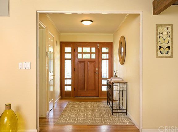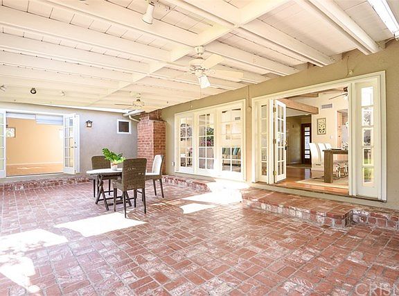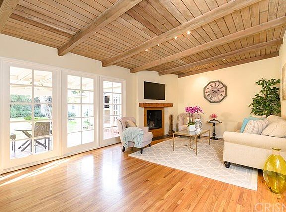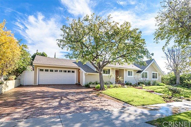 Here it is! Home for the Holidays! Tree lined street, Brick lined walkway leads to a inviting entry hall which leads to a formal living room with fireplace, wood beam ceiling, dining area with ceiling fan, walls of French windows and doors open to covered, brick patio. Open kitchen with tile flooring, granite counters and backsplash. Separate Laundry room and walk-in Pantry with direct access to two-car attached garage. The large Master Suite is stunning. Wood floors, recessed lights, French doors lead to rear yard. True walk-in closet with built-in closet organizers. Master bath with double shower, spa tub, and double sinks. Two secondary bedrooms and a full bath with blue tile floors, decorator accents, and built-in cabinetry complete this side of home. A step-down family room, media room, den, or office, you choose, completes the interior. Enjoy winter nights or summer days on large brick patio, stone bbq area with seating, large grassy area, pool, and a one-room guest unit with bath and kitchen area. Private rear yard. If that is not enough it is also located in the Darby, and Granada Hills Charter school District. Don't miss this one! A true winner!