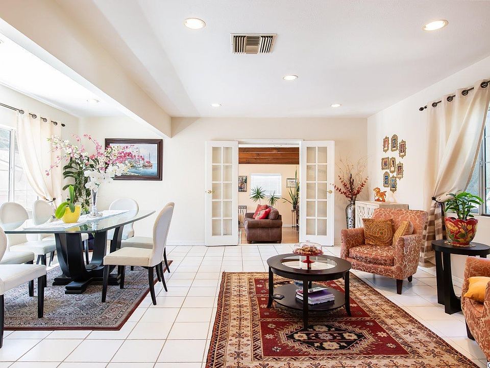 Touched by tradition is this timeless home located in Granada Hills. Nestled on a large 7,499-SqFt, with a floor-plan of 3 bedrooms, 2 bathrooms and 1,623-SqFt of living space. This beauty features details that include tile and wood flooring, soaring high ceilings, recessed lighting, as well as Central AC and French windows. Upon entering you are greeted with a formal living room and dining room. French doors from the living area leads you into a family room that has a wooden beamed ceiling, fireplace, bay window and another set of French doors with access to the back patio. Enjoy cooking in a bright kitchen where you will find dark granite counter-tops, stainless steel appliances and white wooden cabinets. Bedrooms are spacious and have large closets, while the bathrooms are well-lit with natural light. This home also includes a laundry room and tons of storage space. The perfect space to entertaining, the back yard offers a spacious patio that overlooks the spa and pool. There is an abundance of greenery, a large gated lawn and all the much-needed privacy you need. With some TLC you can bring back the sparkle to this gem of a home!