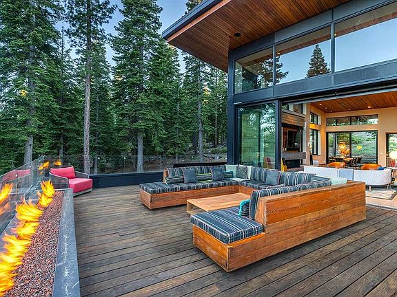 The tone for this Martis Camp estate is established before you even arrive. The driveway elegantly weaving its way up replicates the sophisticated lines you’ll encounter in this 5,664 square foot mountain modern masterpiece. Beyond the large pivot front door is a staircase gliding toward an elevated living space, passing beside a glassed-in wine closet along the way. The reveal at the top of the stairs is impressive, an openness that drinks in immense amounts of light shared between the great room, dining room, and kitchen. Left of the great room is a deck with premier views of the slopes of Lookout Mountain and of the Carson Range further east. The kitchen is adjacent to a patio with hot tub, firepit, barbecue bay, and covered/heated dining space. Beyond it all is the privacy of a neighbor by the name of our National Forest. Along the hallway that skirts the majestic wine closet is a bedroom as well as the primary suite with large fireplace and a balcony with inspiring vistas. Downstairs is a plush theater that also doubles as a golf simulation room. There’s an office down here, along with a bedroom and bunkroom. The apex of this 5 bedroom / 5.5 bathroom home is an office with mini-kitchen and bar, all accessed via stairs or an elevator as bold and distinctive as the rest of this three-story home. With a location at the western boundary of Martis Camp and access to a community trail system less than a minute away, it’s easy to see why Links magazine recently wrote, “Only one thing is more beautiful than visiting Martis Camp, and that is living here.”