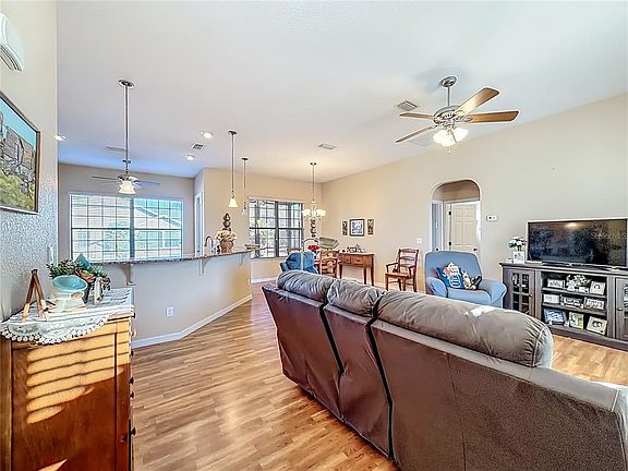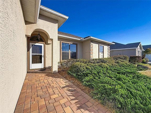 Welcome home to Stonecrest, a sought-after 55+ gated golf cart community known for its resort-style amenities, multiple sparkling pools, and an unbeatable location just 2 miles from The Villages. This lovely extended Lilly model, offers 3 bedrooms, 2 bathrooms, and an enclosed lanai, all thoughtfully designed for comfort, privacy, and entertaining. . Inside, you’ll love the open-concept layout that welcomes you in with views of the living room, dining area, and kitchen—perfect for gatherings or everyday living. The kitchen is both stylish and functional with granite countertops, a garbage disposal, and luxury pendant lighting. Most of the main living areas feature luxury laminate flooring, while the bedrooms are carpeted, and the bathrooms and lanai boast ceramic tile. Elegant arched hallways add character and charm throughout the home. The primary suite is tucked away for privacy and features a spacious walk-in closet and a beautiful Roman shower in the en-suite bath. On the opposite side of the home, you’ll find two guest bedrooms with a full guest bathroom conveniently located between them—ideal for visitors or a home office setup. This split-bedroom floor plan offers both flexibility and privacy. Enjoy Florida living with plenty of outdoor space and no kissing lanai, along with lovely curb appeal and picturesque palm-lined streets throughout the neighborhood. The garage is accessible from both the interior and exterior of the home. Stonecrest is ideally located near shopping, grocery stores, restaurants, banks, gas stations, medical facilities, and entertainment—many accessible by golf cart. And when you want even more fun, you’re just minutes away by car from The Squares, offering nightly live music, dining, and shopping This home truly offers the best of comfort, convenience, and community.