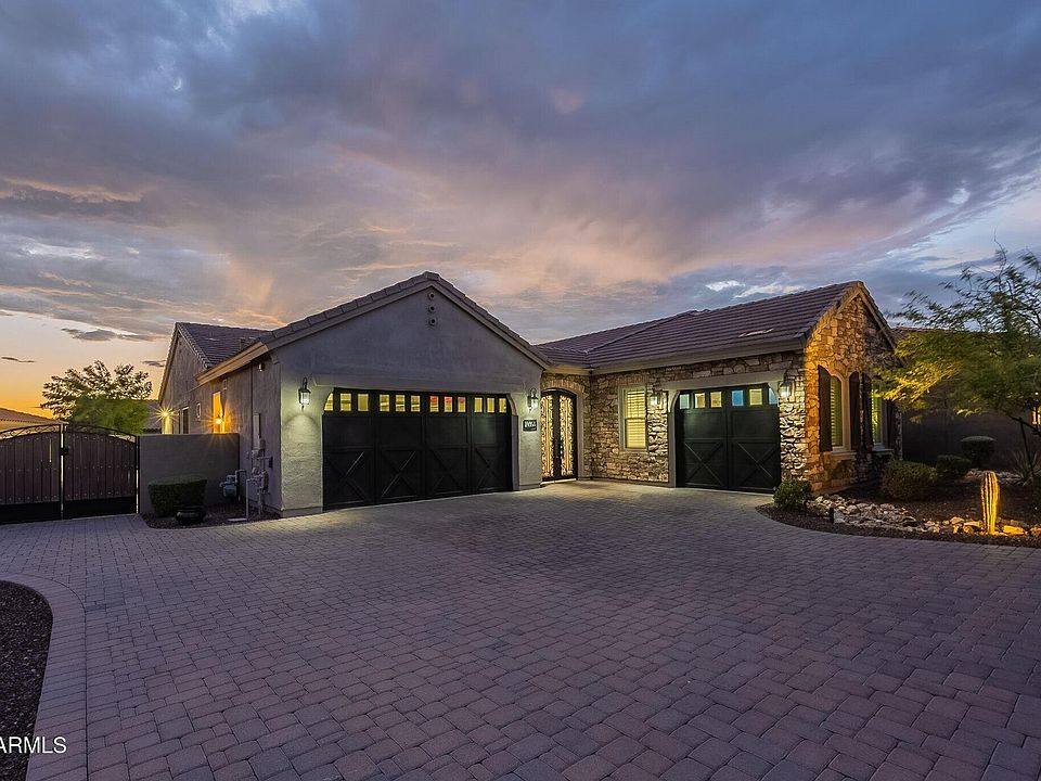 Welcome to this move-in ready dream home in highly sought-after Scottsdale, where mountain views, thoughtful design, and luxurious details come together to create a space that feels as comfortable as it is impressive. As you enter this gated community, you're greeted by lush landscaping and a sprawling park, perfect for morning strolls or evening walks. Drive up to the home and you'll appreciate the generous driveway, with split three-car garage (a two-car on one side and a single-car on the other, both with direct interior access), and even an RV gate, ideal for storing your toys or extra gear. Step through the iron gate into the private front courtyard, a perfect spot for cozy outdoor seating. As you enter the front door, you're welcomed by soaring eleven and a half foot ceilings, elegant light fixtures, and immediate sightlines to the covered patio and sparkling pool. To your right, the formal dining room offers plenty of space for hosting large dinners. Just ahead, the great room features ample seating perfect for movie nights or relaxing with guests. This home offers a generous sense of space, thanks to ten-foot ceilings throughout rest of the home.