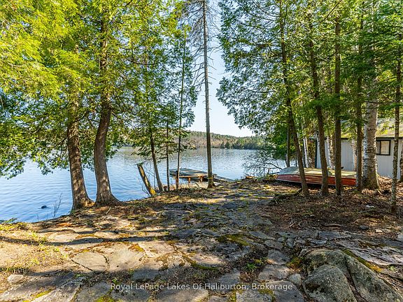 Rare Waterfront Gem on Prestigious Drag Lake's East Bay. Nestled on 9.31 acres of pristine privacy, this spectacular offering on Drag Lake presents an opportunity to own 335 ft. frontage and level lot with clean, deep, rocky shoreline, northwest exposure and unforgettable summer sunsets. This exceptional property boasts a grandfathered cottage location just steps from the water, a rarity on this highly sought-after lake, and offers endless potential for luxury redevelopment or enjoyment as-is. The original 2-bedroom cottage exudes rustic charm with open-stud cathedral ceilings and a sunlit, open-concept layout featuring hardwood floors and a stunning stone fireplace with wood insert. A large picture window in the living room frames panoramic views of the shimmering waterfront. Outside, a stone pathway leads to a dock and deck at the water's edge, where you'll enjoy deep swimming off the dock's end, plus a 20' x 14' bunkie/dry boathouse that sits at the shoreline and offers extra space for guests or storage. A marine railway and shed provide additional utility, and the beautiful, level lot at the waterfront is ideal for gatherings, recreation or future expansion. Just a few minutes away is the village of Haliburton, for all of your amenities. If you've been waiting for that dream-like, private waterfront property on prestigious Drag Lake, with unmatched natural beauty and development potential, don't miss this one!