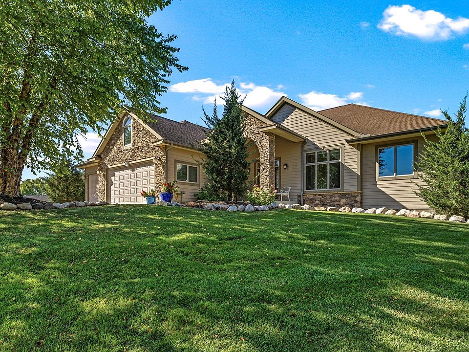 Just minutes from town, this impressive 4 bedroom / 5 bath custom-built rambler offers the perfect blend of privacy and convenience. Thoughtfully designed with high-end finishes and functional living spaces, this home is ideal for everyday living and entertaining. The main level features 10-foot ceilings, gleaming maple floors and an open layout anchored by a stately living room with a gas fireplace, custom built-ins and an abundance of natural light. The gourmet kitchen boasts granite counters, maple cabinetry, a walk-in pantry, built-in desk and instant hot water. The primary suite offers a peaceful retreat with cozy gas fireplace, walk-in closet and a luxurious bath with jetted tub and separate shower (with body jets). A second bedroom on this level also includes a private full bath. Enjoy the convenience of a main-floor laundry (plus an additional hookup in the lower level) and half bath. The walkout lower level is an entertainer’s dream featuring in-floor heat, a spacious family room with full wet bar (frig, oven, microwave, dishwasher and griddle), two additional bedrooms (one with private full bath), a den, hobby room and full bath. There’s also a 35x22 unfinished flex room which would make a perfect theater, exercise space or workshop, complete with in-floor heat. Outdoor living shines with a 26x16 deck and an expansive 54x13 patio (both with gas lines for grill) overlooking the peaceful 2.2-acre setting. The heated 3-stall garage includes attic storage, hot & cold water and a gas line for a grill. Exterior details include durable HardiePlank siding with stone accents and Andersen doors and windows for lasting quality. So much to love here – see supplements for a full list of highlights.