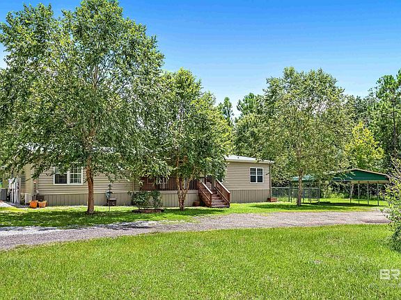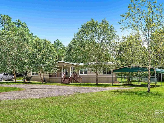 9.4 PRIVATE ACRES! This property has it all. Skirted Manufactured Home with additional rooms - You have - Home, barn, shed, shooting range, duck coop & large wooded lot. Electric Gate to enter. Covered front porch. Large vaulted ceiling living room with wood burning stove with fireproofing that will heat the whole house if desired. Crown molding throughout. Kitchen with eating island, flat top range & dishwasher. Solid wood cabinets with striking backsplash. Living/Dining/Kitchen all have wainscoting & bamboo flooring. Split floorplan with two guest room & shared bath. Large primary bedroom with walk-in closet with built-in shelving & ironing board. Bath has garden tub, double vanities with lots of storage & separate shower. Butler's pantry leads to laundry with toilet. Added on two large rooms - one has built-in bookshelves & the other workshop. Deck off the back is screened overlooking above ground pool. Instant on demand hot water. Partially fenced property. Barn & shed for storing equipment. Shooting range has shooting table. All outbuilding & duck coop have electricity & water. Well for irrigation & city water. Septic has all new field lines & insides. 6 French drains. New exterior vinyl has foam insulation & vinyl. All new gutters. Double pane windows. Conveniently located near Elberta, Foley, Gulf Shores, Orange Beach shopping, restaurants & entertainment. Very Private! Buyer to verify all information during due diligence.
