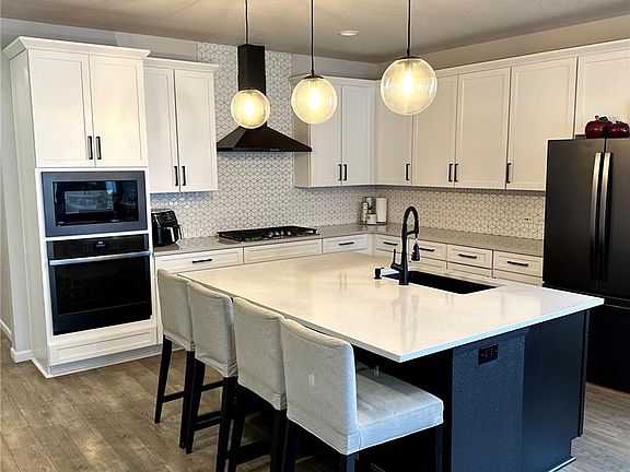 Step through the front door and be greeted by the natural light and LVP flooring that lead you to your open-concept living area. The kitchen is a culinary delight, featuring a spacious island, black slate appliances with a gas range and vent hood, two-toned shaker cabinets, quartz countertops, and an upgraded kitchen backsplash that cost over $26,000 at the design center. Cozy up next to the gas fireplace in the living room and enjoy a cup of coffee or tea.