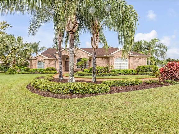 Two 0.45-acre corner lots were thoughtfully merged in 2017 to form a nearly one-acre (0.90 acres) estate, delivering exceptional space, privacy, and a backyard made for entertaining. A former model home with a pool sits on one lot, while the second lot features a separate concrete driveway with crushed asphalt parking for RVs and boats, a shed, and three Bismarck Palms—step beneath them and you’ll feel like you’ve stepped into Jurassic Park. Lush landscaping throughout the property provides ample space for privacy, enjoyment, and entertaining. Fully fenced and irrigated with a newer artesian well, the combined yard offers stunning beauty in all directions—almost like being in an amusement park—and sits about 2 miles from I-4, putting Orlando, Daytona Beach, and other destinations within 30+ minutes. Sturdy vinyl fencing includes three gates—double-gated at the second driveway—with paver paths connecting both side gates and driveways. An outdoor kitchen, extended decking, and an extended lanai further enhance this private retreat for spectacular entertainment and use. Inside, the split floor plan features model-home enhancements throughout, including gabled ceilings, picture windows, decorative tiling, nooks, and more. Three bedrooms and two full baths are located on one side of the home, including a bath with direct access to the pool. The primary bedroom occupies the opposite side, beyond the kitchen and dining/living areas, providing privacy and separation. The updated kitchen is open to the family room and offers direct views of the pool. It features quartz countertops and a pantry for added storage. All-new 2025 stainless steel appliances include a refrigerator, microwave, glass-top range, and dishwasher. The spacious primary suite also has a pool view through a large sliding door and includes a mirrored-door walk-in closet, separate toilet closet, soaking tub, shower, and dual-sink vanity. Move-in ready with thoughtful updates throughout—including a newer roof (2014), AC (2018), and water heater (2024)—this property highlights convenience, style, and Florida landscaping at its best. Absolutely Breathtaking!