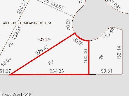 Palm Bay oversized 0.33 acre lot, Port Malabar Unit 51 Lot 27 Blk 2747. This vacant lot has road access with no utilities; great investment opportunity. Adjacent 0.28 acre lot also available at 1090 Uncas St SW Palm Bay FL 32908. Malabar Rd, South at Emerson Dr, right at Jupiter Blvd, left at Degroodt Rd, right at St Andre Blvd, left at Drude Park Ave, left at Ponder St, right at Colton Ave, right at Uncas St, lot on left at cul-de-sac.