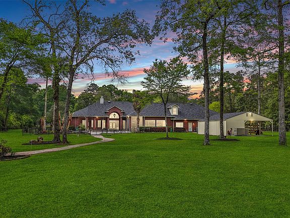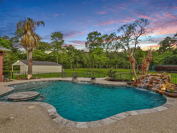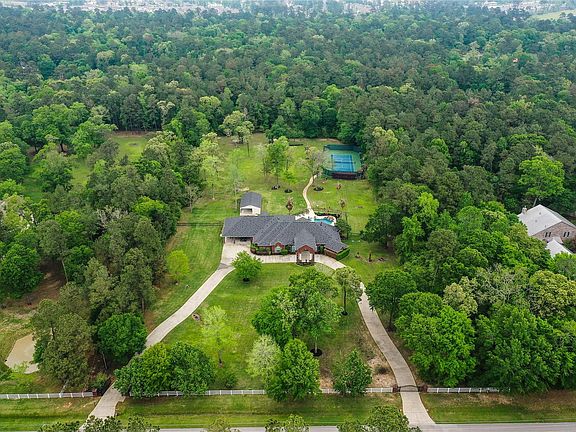 This absolutely STUNNING home is on 5 acres, and fully gated. It includes a pool, spa, screened in patio, tennis/basketball court w/cabana, and circular drive. Master suite is a romantic dream come true, complete w/fireplace, private door to pool, sauna, oversized custom closet, and a cedar lined closet. Spacious family room offers a gorgeous fireplace with walls of windows providing a spectacular view of park-like landscaping and nature at its finest! Chefs kitchen w/wine storage is perfect for entertaining as it opens to both living areas. Large upstairs bonus room can be used as a media room, craft, exercise, or game room. Spacious 3 secondary bedrooms with ensuites are on the opposite side of house for total privacy. Enjoy strolling or biking through this beautiful neighborhood of estate homes. There is a private subdivision arena for your horses, 3 nearby grocery stores, restaurants, and a new movie theater, as well as minutes from all that The Woodlands has to offer.