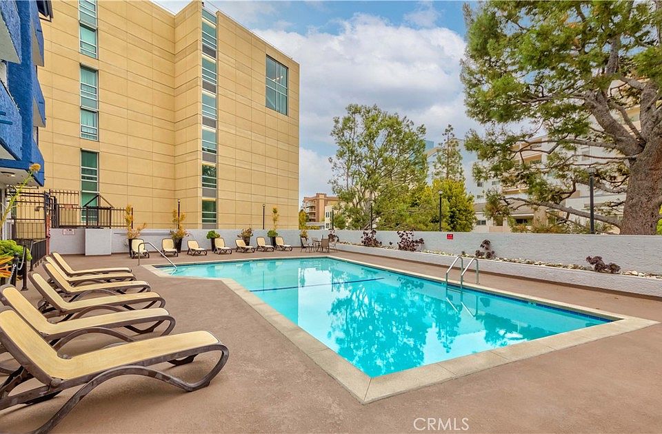 Club CA front-facing condo with hardwood laminate floors and 24 foot long private balcony. Modern open kitchen has stainless steel appliances, granite counters, peninsula with breakfast bar and storage. Two large closets have built-in shelves for extra storage space. Energy efficient air conditioner/heater and LED lighting. Upgraded brushed nickel hardware on doors, drawers, lighting and plumbing fixtures. Club CA Amenities include solar heated resort style outdoor pool, BBQ area, modern 2-level fitness center, ping pong room, 3 community laundry rooms, elevators, and lounge with pool table, poker tables, flat screen TV plus WiFi. Club CA security features include on-site manager, security cameras, secured underground gated parking, keycard access and a secure package delivery system. Great investment with excellent location two blocks to UCLA Medical Center and one block to Westwood Village with restaurants, theatres and shopping. The condo unit is near the lobby elevator, front stairwell and laundry room. This spacious studio provides privacy without the high price of a one bedroom unit. Includes one assigned parking space in secured underground garage. Assigned parking space #78 on P2 is in a section with only 2 vehicles (extra space on driver side, which borders a post). HOA dues include water and trash collection. Unit comes furnished.
