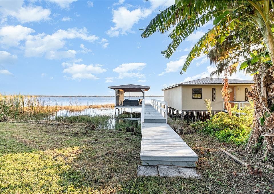Welcome to 1099 Grove Avenue, a rare lakefront opportunity in the heart of historic Mount Dora. Privately set on a quiet road just minutes from downtown shops, dining, and waterfront events, this beautifully renovated property offers direct access to Lake Dora and the relaxed elegance of true Florida lake living. The main residence has been thoughtfully updated with luxury vinyl flooring, a fully remodeled kitchen featuring custom wood cabinetry, quartz countertops, a striking wood hood, and full-height backsplash. Updated bathrooms include modern finishes and glass enclosures, with an added en-suite bath to the primary bedroom. Light-filled living spaces flow seamlessly into a sunroom and flexible interior areas enhanced with upgraded glass panels designed for year-round comfort. Outdoors, enjoy a fenced pool area, multiple entertaining spaces, and a private screened dock overlooking Lake Dora — ideal for boating, fishing, or sunset views. Recent improvements include major system updates such as a newer roof, upgraded septic system, resurfaced driveway, enclosed crawlspace, water purification system, and a recently installed HVAC unit. A separate living structure provides additional flexibility, offering updated flooring, refreshed kitchen cabinetry, renovated bathrooms, and multiple access points to outdoor patios and storage. Whether used for guests, extended living, or creative space, it adds versatility to an already exceptional property. With walkability to downtown Mount Dora and private lake access rarely found this close to town, 1099 Grove Avenuedelivers lifestyle, location, and value in one unforgettable offering.