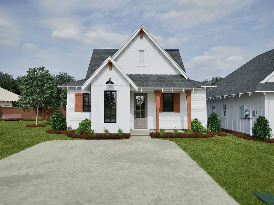 The Telford is a two bedroom, two bathroom, 1255 square foot home. From the covered front porch, the entrance welcomes guests into the open concept kitchen and dining room. The kitchen features a large center island and two pantries.The laundry room is located at the front of the home off the kitchen. The dining room flows into the spacious living room that features large windows. The primary suite rests on the back of the home and features a large bedroom and en suite bathroom with a large walk-in closet. The Telford features a second bedroom and bathroom on the front of the home.