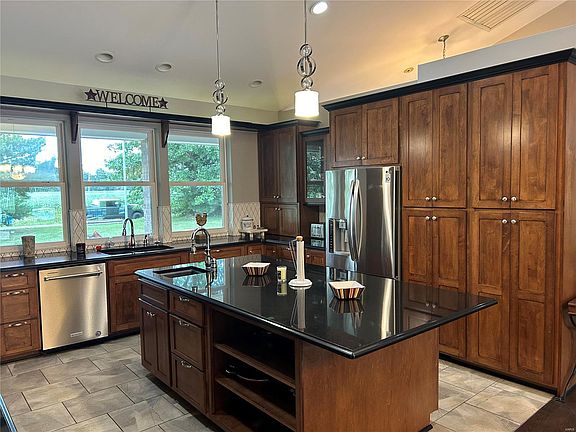 Custom ALL-BRICK RANCH in TRIAD SCHOOL DISTRICT. Beautiful 2 acre tract with a nice wooded back drop. Unique, open floor plan boasting a vaulted ceiling and a see-through gas fireplace between the great room and Primary bedroom. Gorgeous kitchen cabinetry and a MASSIVE CENTER ISLAND with granite counter top that compliments the new backsplash and updated appliances. Primary bathroom is HUGE, offering his & hers walk-in closets, double vanities, soaking tub and custom-tiled, walk-in shower.