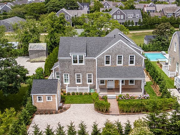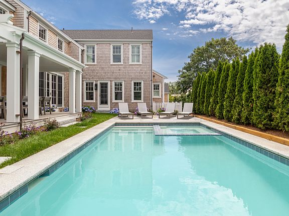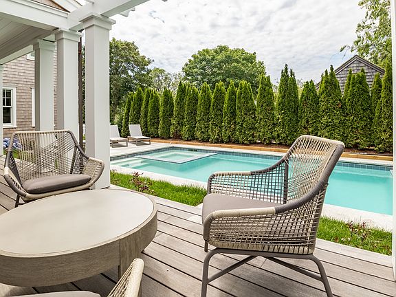 - A, AC, Disp, Ins, Irr, Floor 1: Through the front door, there is a large, welcoming foyer with ceilings open to the second floor. There is a half bath to the right. To the left is the primary suite with a King bed, featuring an eye-catching tray ceiling feature. There is a sliding barn door to ensuite bath that has a tiled shower, a free standing tub and a double vanity. Past the entry is the gorgeous kitchen with quartz countertops throughout, tiled backsplash and a large, one-of-a kind island with a five burner Wolf cooktop. A side door off the kitchen brings you into a well thought out mudroom area with with built in cabinets on either sides of a custom cushioned bench, a separate laundry room that has two sets of washers and dryers, and a large pantry with plenty of cabinets and a Subzero beverage refrigerator. The kitchen flows into the Great Room, featuring a dining area with a table that has seating for eight and a large living area featuring vaulted ceilings, a Valor gas fireplace encased in quartz tile. The sliding Nanawall door to the deck and pool/spa truly merges inside and outside living. On the covered deck there is a dining table seating eight and chairs for lounging in the shade. There a 13'8" X 26" heated pool and spa with an auto cover and a bluestone patio. Evergreens surround the pool and side yard areas for privacy., Floor 2: Head up the beautiful oak and glass custom staircase which is open to the first floor. At the top of the stairs to the right you will find a second living area and a tiled shower bath. To the left is a King ensuite bedroom with a tiled shower bath. Down the hall are two additional bedrooms, one with queen bed and the other with two full beds. These two bedrooms share a jack and jill bath with double sinks and a tiled shower.