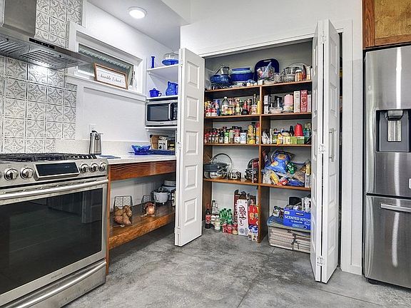 Designed with both comfort and style in mind, the home features a well-appointed kitchen with white quartz countertops, a deep sink, and a 5-burner gas stove with convection oven. A large pantry provides ample storage, while open upper and lower shelving offers a perfect space to display glassware and dinnerware. A built-in bench at the counter creates generous seating for family and guests.