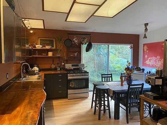 Single family home in the front of Fern Forest on front acre of a 3 acre property. 10-15 minutes form Volcano Nat. Park. Freshly painted inside with 9ft walls and new flooring throughout, making for a clean and classy interior. Full kitchen with gas stove, stainless appliances, and passive skylights. Master bathroom has a Jacuzzi tub. There is a ground level screen room from the living room slider, with a washer and dryer. There is fencing around the house, so small to medium dogs are okay. Through any of 5 sliding glass doors, you will see Mature landscaping with ornamental and fruit tress, bananas, and beautiful views of Mauna Loa and Mauna Kea.