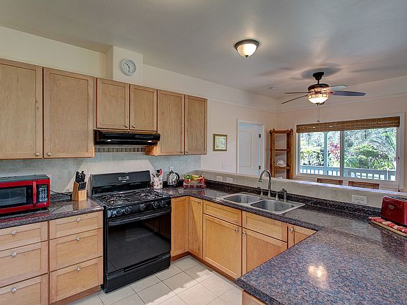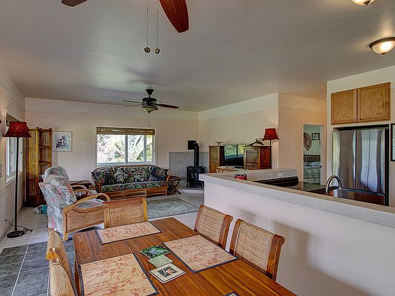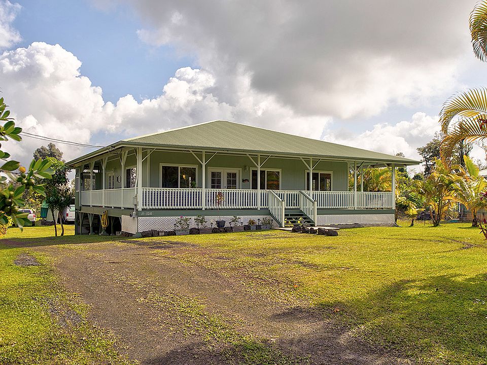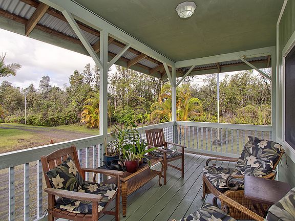 Special features include an efficient kitchen with pantry, tiled showers, and upgraded flooring throughout. There is a directionally correct mosaic tile medallion of Hawaii Island in the middle of the living room floor. The unique "closed" no-evaporation water catchment system is based on a design used by commercial bulk liquid tank storage facilities. The air vents are screened and there is an attachment so a fire truck hose can connect. This sale includes a container workshop that has a sided tandem carport attached. There is a Quonset type covered structure to park or store equipment. Included is an additional high cube 40 ft shipping container. It has been painted & the roof has a snow-coat sealed. Fern Acres is located near Mt. View at an elevation that is just the right temperature year around. This is a unique opportunity for an extra special home on acreage.