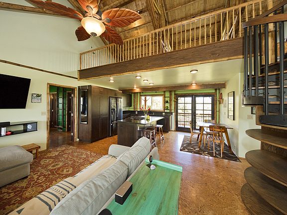 Situated at the end of a 600' driveway amongst native Ohia forest and professional permaculture architecture, this bamboo family home is equipped with modern off grid amenities. With 32kwh of Blue Ion batteries on an 8kw inverter, solar hot water with on demand propane variance, 12kL water catchment on a triple filtered system so you can drink purified rainwater out of any spigot, ultra high speed fiber internet, on-site septic, entirely fenced in, remote gate with keypad access, and paved neighborhood roads, you'll never notice you're living off the grid. The interior of the home features cathedral ceilings, three bedrooms, two bathrooms, a carpeted loft over the master suite and great room, soft-to-walk-on cork flooring throughout, custom cabinetry with quartzite counters. The spiral staircase to access the great room loft has a built-in spiral bookcase. The home is slightly tilted on the lot to align east-west, with the master suite situated on the west end for cool, dark mornings, and solar panels on the south roof for maximum absorption. Elevation at 1500' means neither heat nor AC are necessary, as summers are delicious and winters are bundly. The covered lanai wraps around 3/4 of the house, with sliding door access to all rooms, and views of Mauna Kea, Mauna Loa, and Kilauea when she puts on her beautiful displays over the forest. Mature lemon, lime, tangerine, avocado, banana, mountain apple, sweet potato, taro, cassava, relenia, herbs, lumber bamboo and more means you can move in ready to start harvesting. In the backyard is an amphitheater built into a natural bowl in the land, and in the front the driveway connecting the garage to the carport under the house is a skatepark for a lifetime of fun. 30 minutes to Hilo, 20 min minutes to Volcano. Very private. Square footage differ from tax record.