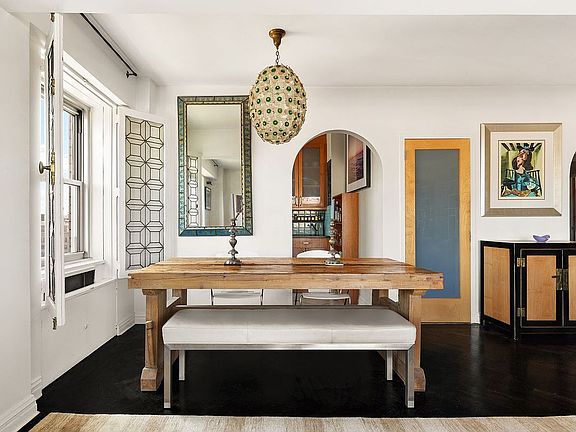 Distinguished by its character and well thought out design, this residence is a rare offering within the building. Beamed ceilings, arched doorways, and thoughtful built-ins set it apart, while details such as a stripped metal front door, vintage 1950s glass shutters in the dining area, and solid oak herringbone floors bordered in mahogany add warmth and charm.
