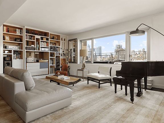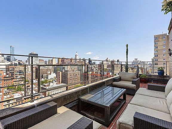 The expansive living room faces north and east, with oversized windows that frame the iconic New York City skyline and flood the space with natural light throughout the day. Directly off the living area, the terrace creates a private oasis high above the city—ideal for morning coffee, evening cocktails, or quiet relaxation.