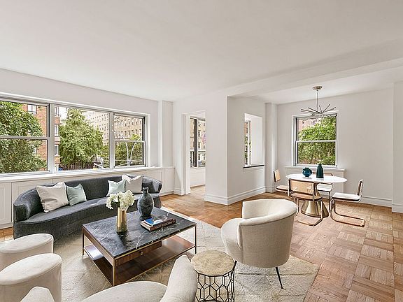 A formal entry gallery opens to a sun-splashed great room that comfortably fits two seating areas plus a dedicated dining alcove. Generous living spaces and extra-wide, wall-to-wall windows amplify the light and scale. The home’s outdoor space is currently enclosed, creating a versatile four-season sunroom—an ideal home office or serene lounge—that can be restored to an open-air balcony if desired. A glass-wrapped den with dual exposures frames classic prewar architecture.